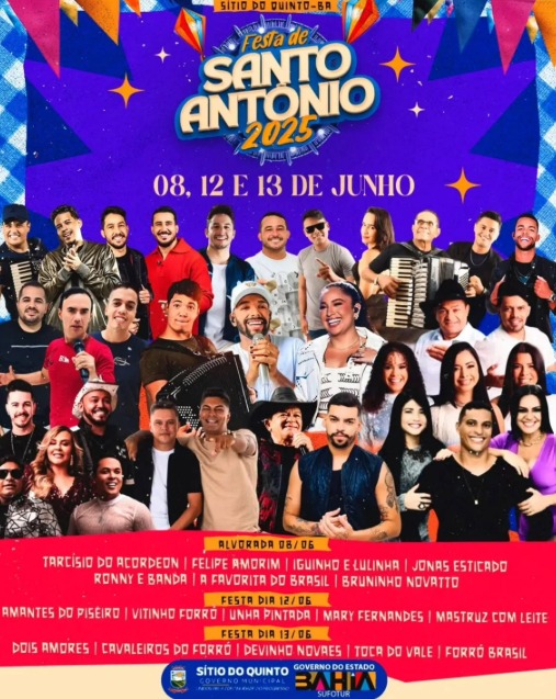 Confira abaixo a grade de atrações da Festa de Santo Antônio 2025 que foi confirmada pela prefeitura, com as bandas que irão se apresentar entre os dias 08 a 13 de junho de 2025, na Praça Erico Damacena em Sítio do Quinto, no interior da Bahia.