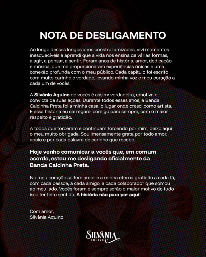 “A Silvânia Aquino de vocês é assim: verdadeira, emotiva e convicta de suas ações. Durante todos esses anos, a Banda Calcinha Preta foi a minha casa, o lugar onde cresci como artista. E essa história eu carregarei comigo para sempre, com o maior respeito e gratidão”, revelou.