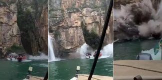 Vídeos: Rocha se desprende e cai sobre lanchas em lago no...